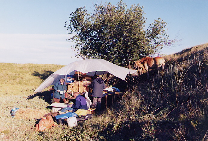 Research crew on preliminary survey, summer of 2002. Analyzing and recording data in camp.