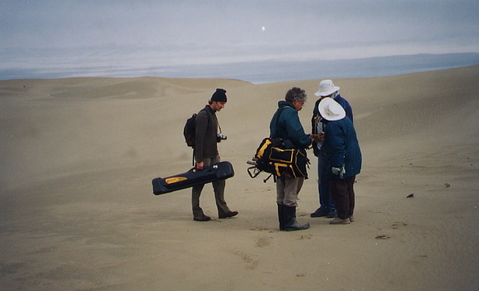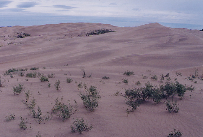 Hydrology, Biomass and ClimateThe idea behind our first expedition to the Great Sand Hills of Saskatchewan was to gather preliminary evidence for measuring the rate of increasing movement among the dunes and survey what seems to be a decline in vegetation in the hope of understanding further the climactic changes in the north west. Toward this end we chose seven of the largest and most active dunes along with two nearby inactive which still had some vegetation on top and through triangulation positioned each on a grid (twenty- one dunes in total). On top these dunes we buried a small piece of metal (perforated strapping) for verification- later- and established locations for each with a g.p.s. finder. Then on the top of inactive dunes a square meter was demarcated by wire and all growth identified, enumerated and catalogued. Samples were also taken of each specimen identified along with soil samples for the measuring of moisture content and other analysis. In addition, the declivity (lowest point at the bottom of each active dune) was identified and the distance to the apex measured. All flora and fauna in the immediate area was noted and our initial observations yielded some dramatic insights. Most shrubs and bushes especially the willows, the birch and the poplar or aspen groves were obviously either dying off or severely stressed. The most notable decline however was in the matting of creeping juniper which had seemed to stabilize the entire area and to a lesser extent in the growth of sage itself. All data will be published on this website at the conclusion of the study.